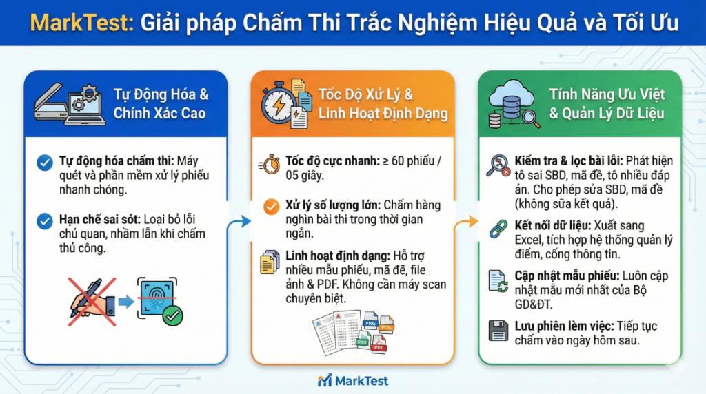 – Phần mềm chấm bài thi trắc nghiệm MarkTest được xây dựng và phát triển giúp cho các đơn vị quản lý Sở GD&ĐT, Phòng VH – XH, các đơn vị cơ sở giáo dục nhà trường và giáo viên giảm bớt được nhiều thời gian trong quá trình tổ chức chấm bài thi, bài kiểm tra trắc nghiệm trên giấy và cho ra kết quả chấm chính xác gần như tuyệt đối.